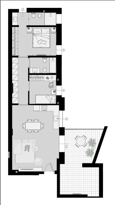 L’ingresso si apre direttamente sulla luminosa zona giorno, caratterizzata da un ampio soggiorno con area living e zona pranzo, perfettamente collegato alla cucina. Gli ambienti, ben distribuiti e armoniosi, godono di grande luminosità e affacciano sullo spazioso terrazzo, perfetto per momenti di relax all’aperto, pranzi e cene in compagnia.