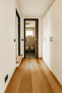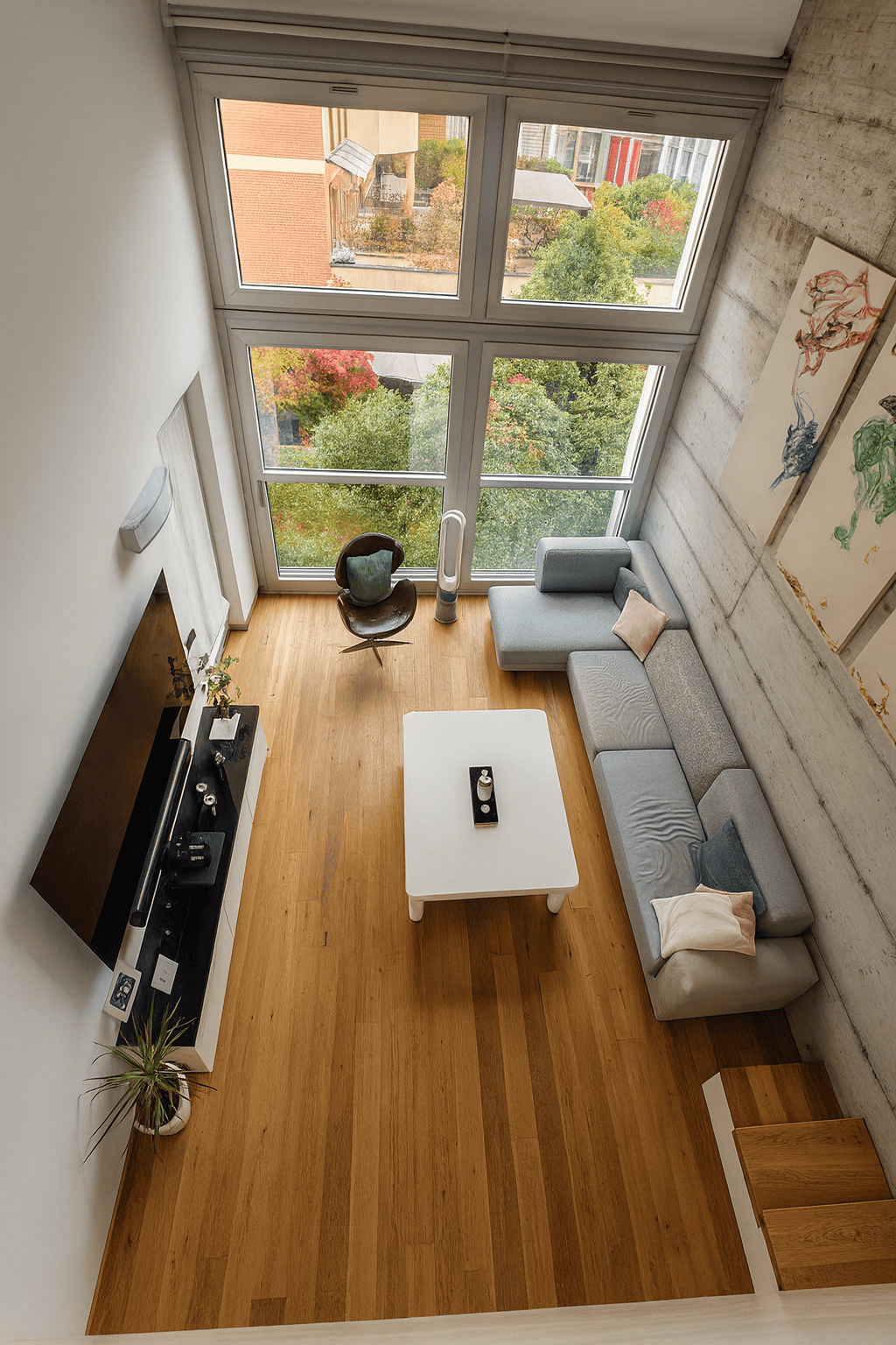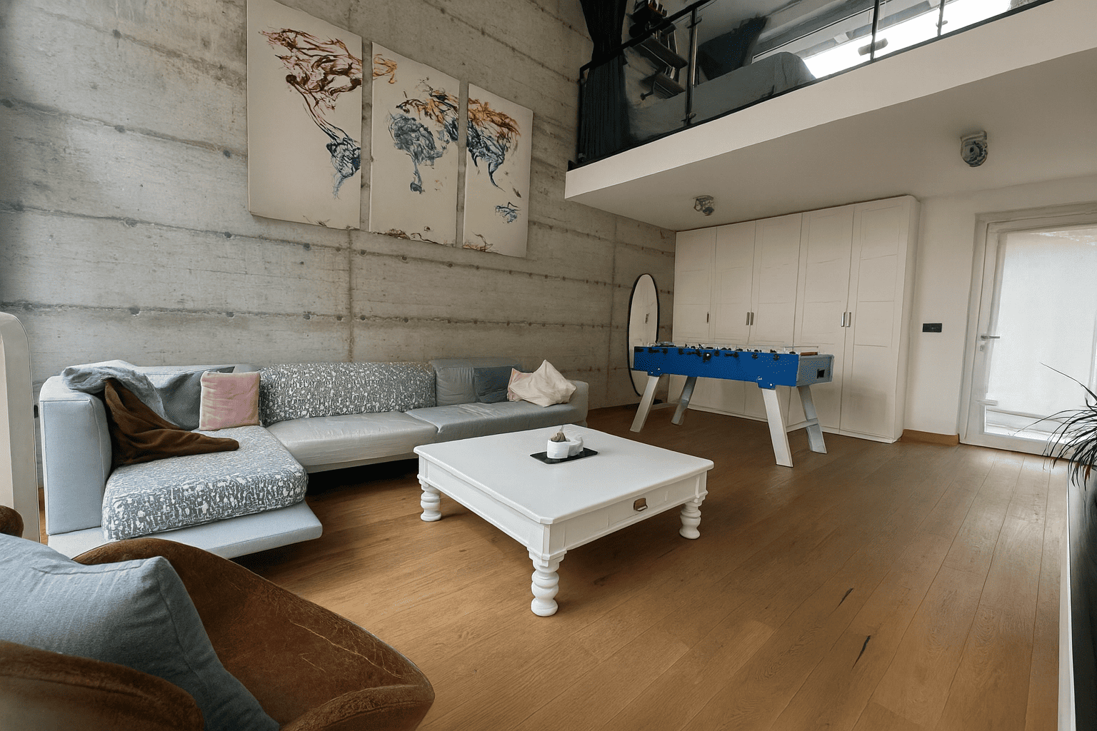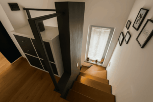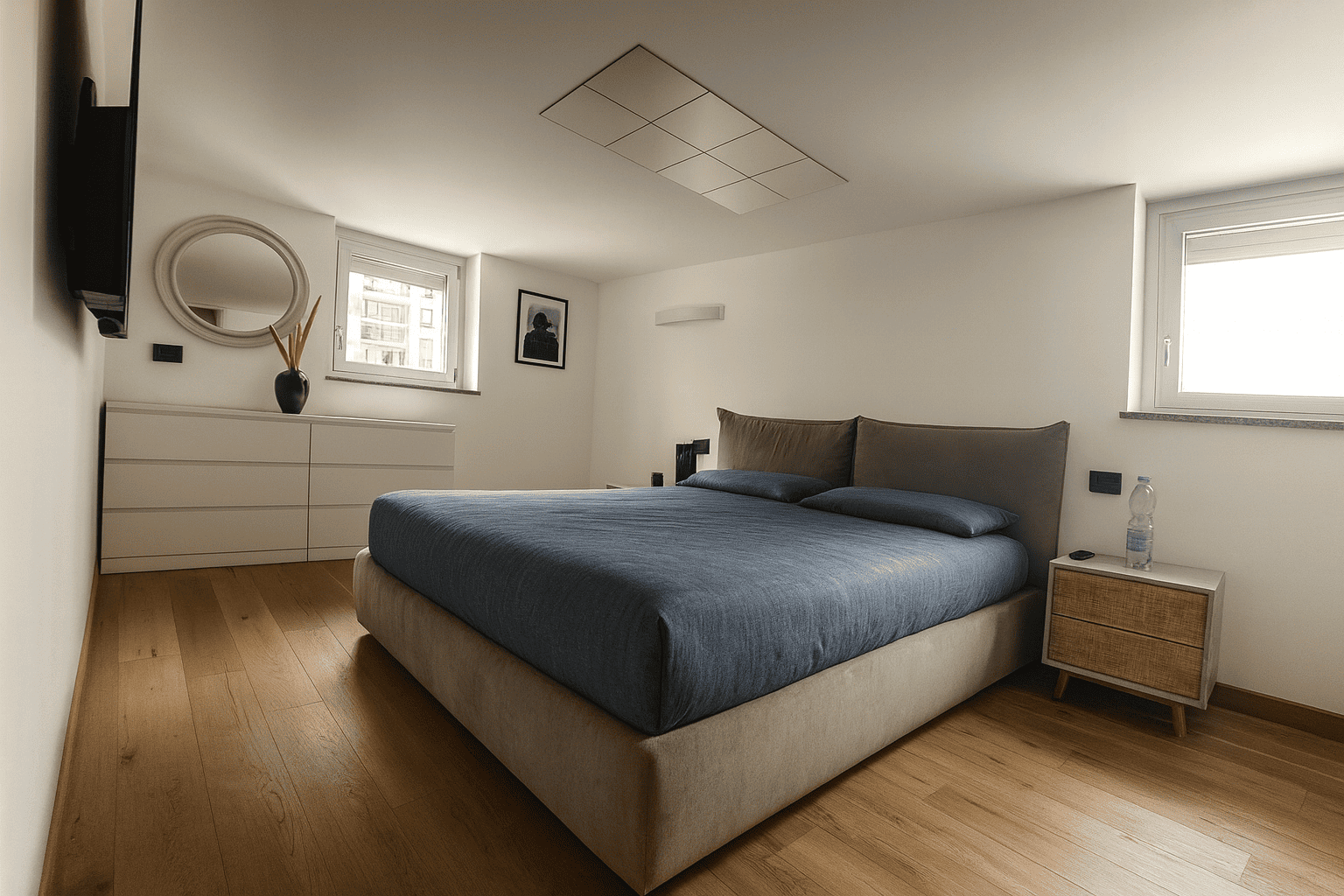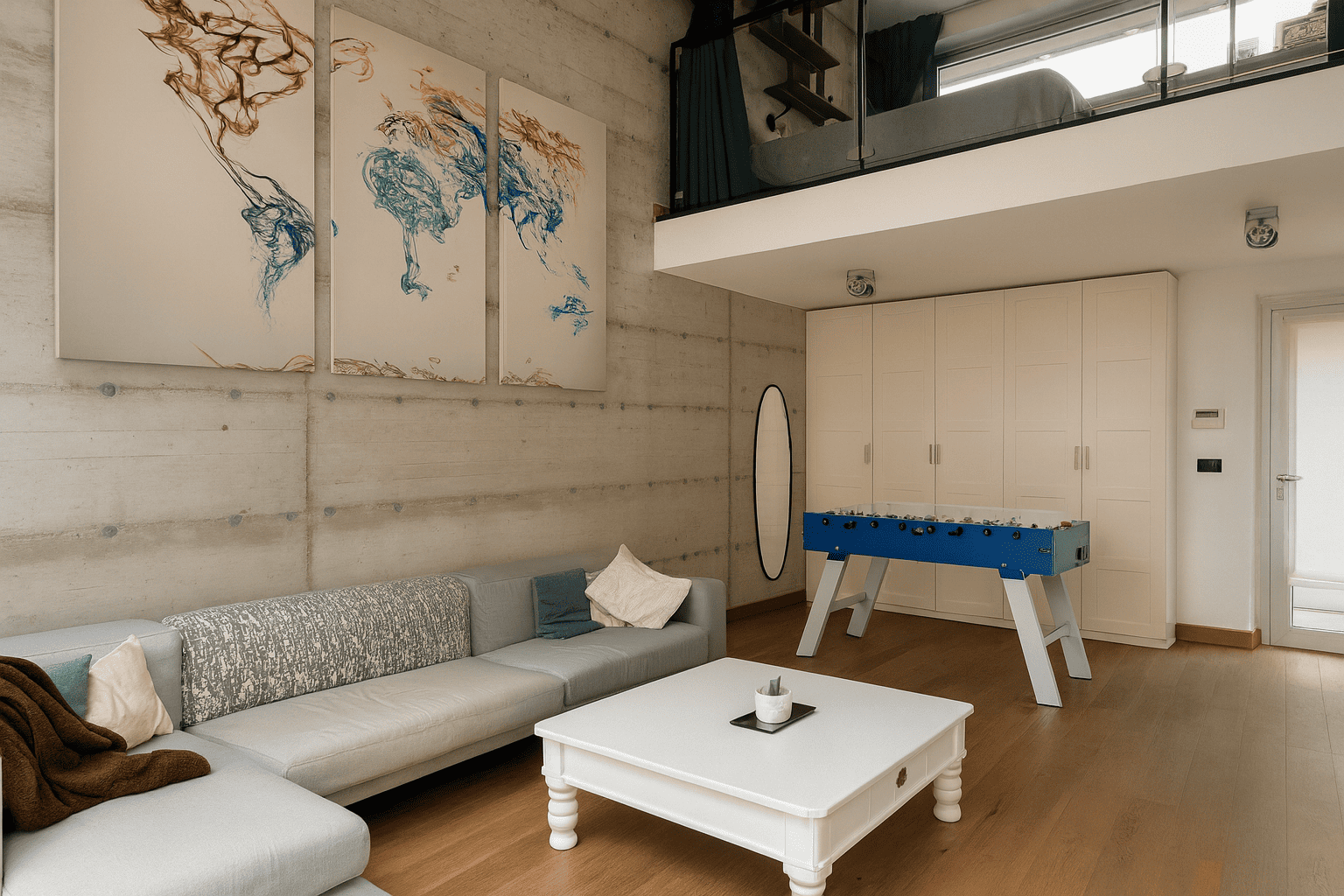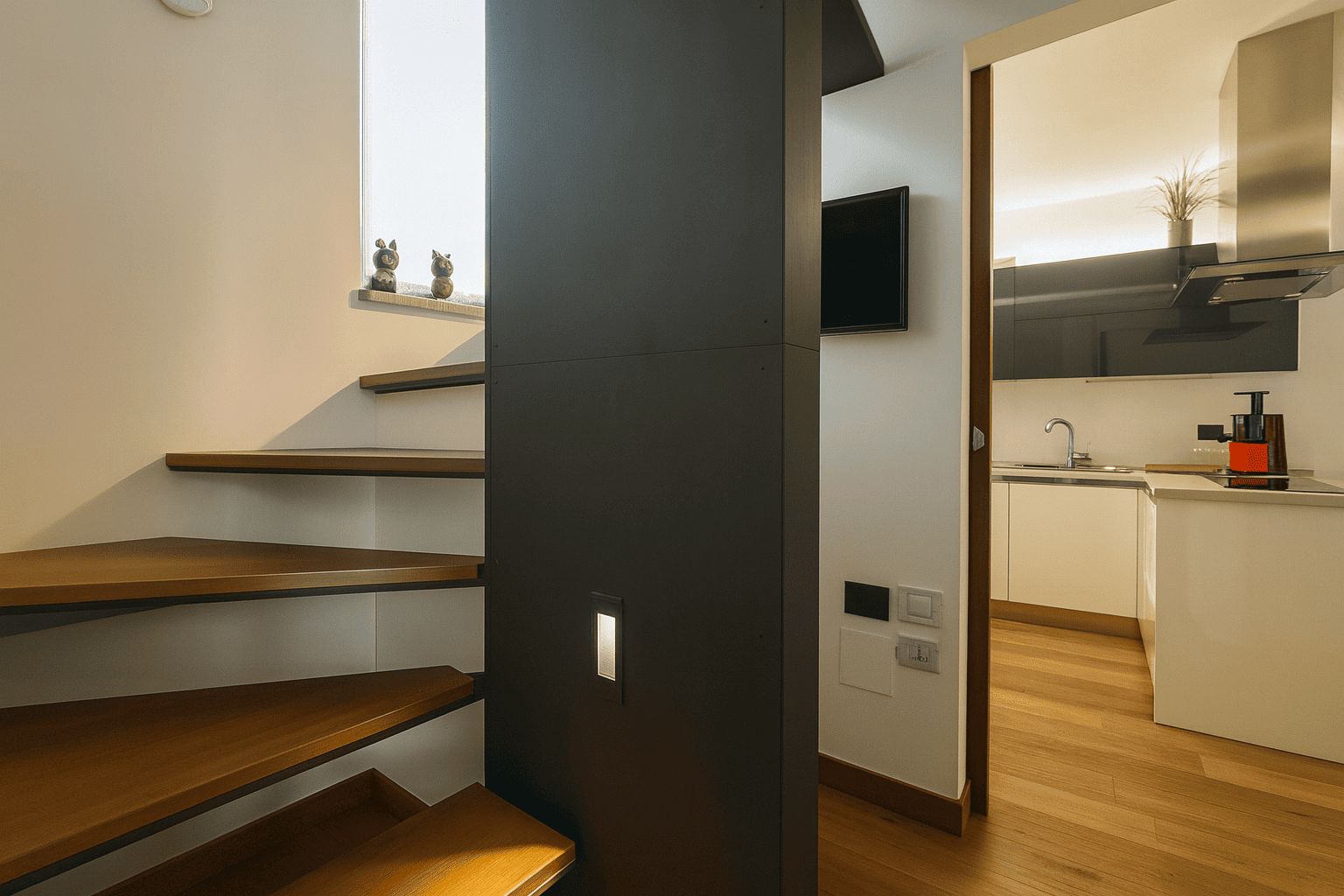 Salendo al piano soppalco si trova un secondo disimpegno che affaccia sul vuoto del piano sottostante e un pratico ripostiglio, ideale come area guardaroba o deposito. Questa parte dell’appartamento, perfettamente vivibile, si presta facilmente ad accogliere una zona notte o uno spazio studio.